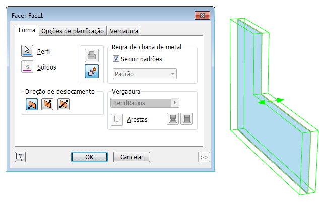 Muitas pessoas mostraram o desejo de centralizar a peça de chapa de metal ao longo de sua espessura. Ouvimos essa solicitação, e agora o comando Face oferece suporte à extrusão de plano médio para a criação de uma face simétrica.