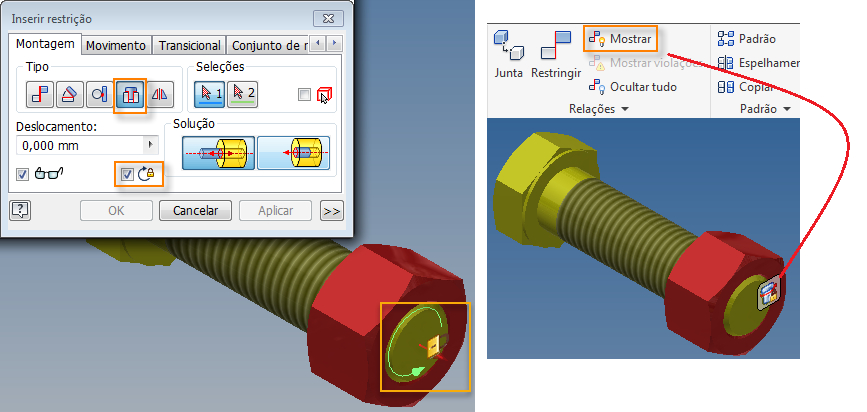 Use a nova opção Bloquear rotação para bloquear os graus de liberdade de rotação em um componente ao inserir uma restrição de inserção. Essa opção impede a rotação da peça.
