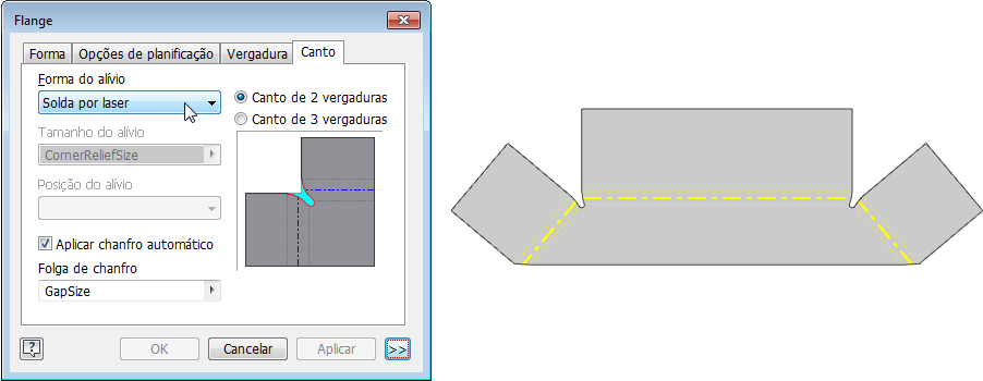 O alívio de canto Solda linear termina em um ponto, e o alívio de canto Solda de arco termina com um segmento de linha reta. O novo alívio de canto Solda por laser termina com um arco tangente e é mais adequado para peças de corte a laser.