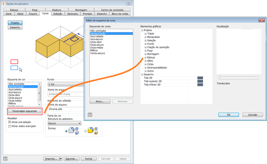 O Editor do esquema de cores é instalado como parte do Inventor 2019. Você pode acessá-lo em Opções do aplicativo > guia Cor. As personalizações são salvas no arquivo xml de Opções do aplicativo.