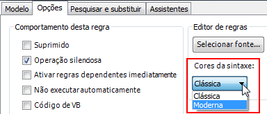 | Guia Opções do Editor de regras | Exemplo das novas cores da sintaxe |