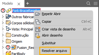 Se você abrir um arquivo de peça ou de montagem com referências ausentes a um ou mais arquivos do AnyCAD, será exibida a caixa de diálogo Resolver vínculo para que você possa pesquisar e localizar as referências ausentes. Se você optar por ignorar as referências não resolvidas, será exibido o ícone Não resolvido ao lado do nó superior do navegador no arquivo aberto. Você pode reabrir a caixa de diálogo Resolver vínculo clicando com o botão direito do mouse no nó superior do navegador e selecionando a nova opção do menu de contexto Resolver arquivo.