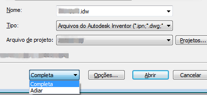 - Uma caixa de combinação que permite abrir no modo Completo ou Adiar foi adicionada entre os botões Opções… e Início Rápido. O comando Adiar combina os comandos anteriores Adiar atualizações e Abrir rápido em uma única ação, fazendo com que o documento de desenho seja aberto sem a atualização ou o carregamento de documentos de referência (peças, montagens, etc.).