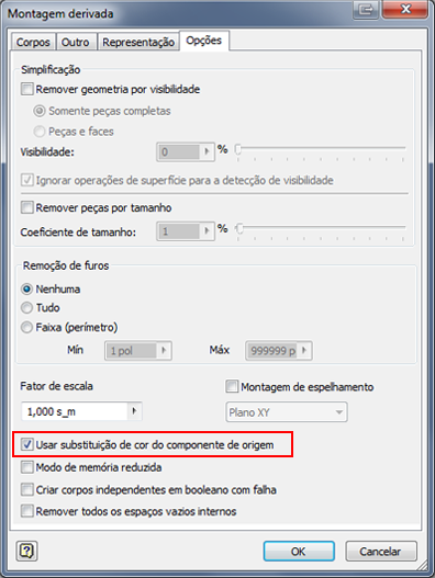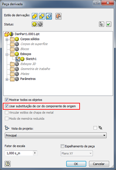 A nova opção Usar substituição de cor do componente de origem foi adicionada às caixas de diálogo Montagem derivada, Peça derivada, Criar peça e Criar componente. Essa caixa de seleção, quando marcada, insere na nova peça as substituições de cor da aparência e do corpo da peça, da operação ou da face aplicadas nas faces da peça derivada. Se a caixa ficar desmarcada, a aparência será definida como padrão.