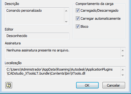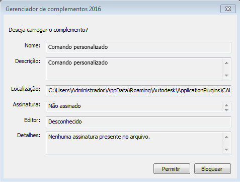 Quando um complemento de produto que não é da Autodesk é carregado, uma nova caixa de diálogo exibida. Agora você pode optar entre permitir ou bloquear um complemento no carregamento. Essa configuração será mantida em sessões futuras. É possível examinar ou alterar as configurações de Permitir/Bloquear utilizando o Gerenciador de complementos.