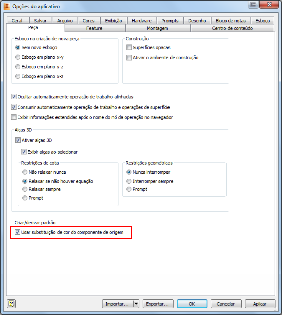 É possível definir uma configuração global que faça com que a caixa de seleção Usar substituição de cor do componente de origem permaneça marcada ou desmarcada durante toda a sessão. Essa caixa de seleção pode ser acessada na caixa de diálogo Opções do aplicativo, em Criar/derivar padrão, na guia Ferramentas da faixa de opções.