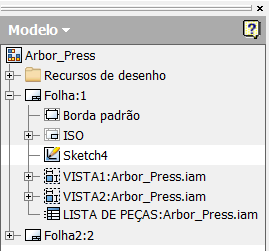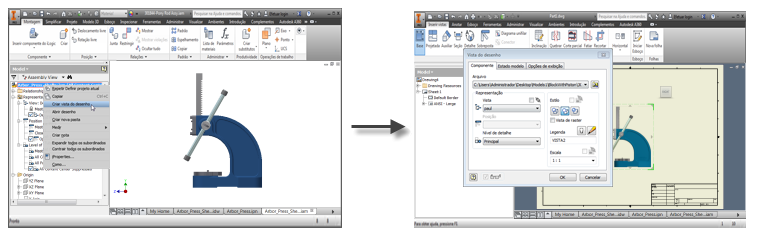 Um novo comando Criar vista do desenho mescla várias etapas em uma, para que você possa criar rapidamente vistas de desenho a partir de um arquivo de modelo. No arquivo de modelo, organize o modelo como desejar. Clique com o botão direito do mouse no componente raiz no navegador e, em seguida, clique em Criar vista do desenho.