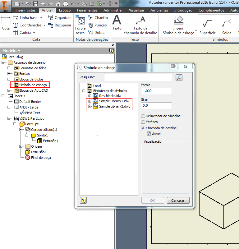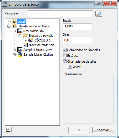 Agora é possível inserir formatos de arquivo IDW ou DWG na biblioteca de símbolos de esboço. Uma biblioteca de símbolos de esboço pode ser criada nos formatos IDW e DWG permitindo a inserção de símbolos contidos no arquivo da biblioteca de qualquer dos dois formatos.