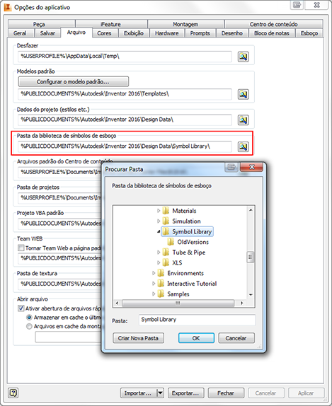 Na guia Arquivo da caixa de diálogo Opções do aplicativo, há uma nova entrada de configuração disponível chamada Pasta da biblioteca de símbolos de esboço. Nessa entrada, você pode especificar uma pasta fora da estrutura do Design Data para armazenar seus modelos de biblioteca de símbolos de esboço. Selecione o ícone de Procurar para localizar um arquivo ou clique em Criar nova pasta para criar uma localização para armazenar as bibliotecas.