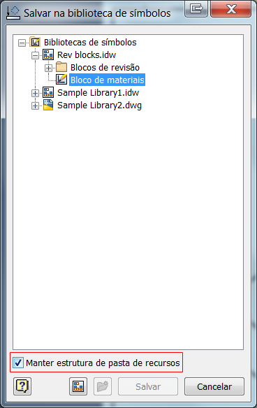 Ao salvar os símbolos de esboço em uma biblioteca, mantenha a estrutura de pastas da biblioteca. Para fazer isso, clique na caixa de seleção Manter a estrutura de pastas de recursos.