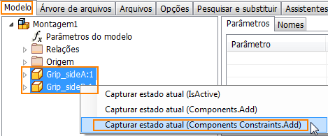 Passo 2 No arquivo de montagem, na guia Modelo da caixa de diálogo Editar regra, selecione os nomes de peça, clique com o botão direito do mouse e selecione Capture.Current.State (Components Constraints.Add) no menu de contexto. |