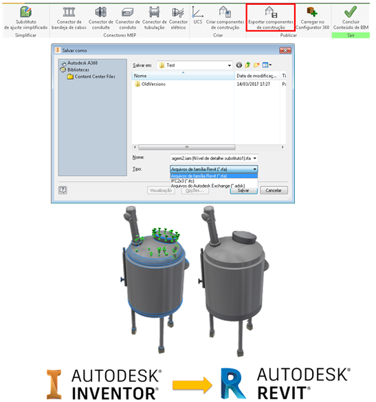 O Conteúdo de BIM foi aprimorado para simplificação, autoria e publicação de fluxos de trabalho. O Inventor 2018 permite publicar diretamente nos formatos de arquivo IFC e Revit (.rfa).