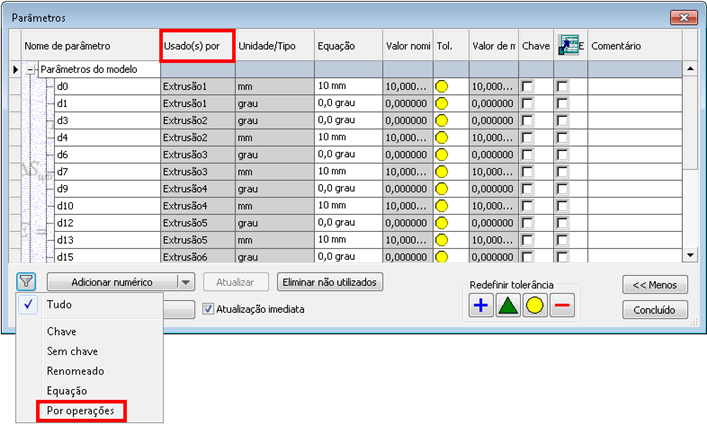 A caixa de diálogo Parâmetro foi aprimorada para incluir a coluna Consumido por e o filtro Por operações.