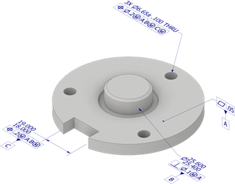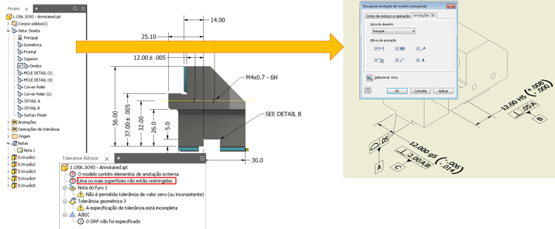 A Definição com base em modelo (MBD) é um novo e poderoso conjunto de ferramentas para a adição de anotações, GD&T e outras informações de manufatura diretamente em peças 3D. O Tolerance Advisor integrado verifica a integridade de seu esquema de segurança e lista potenciais problemas, erros e outras informações em seu navegador. Assim que a MBD e as Anotações 3D forem aplicadas ao seu modelo 3D, você poderá recuperar o desenho 2D e exportar em PDF 3D ou STEP AP242.