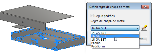 Peças de chapa de metal com vários corpos agora oferecem suporte a regras e espessura específicas para cada corpo. As regras de vários corpos podem ser aplicadas a corpos no navegador ou ao criar novos corpos nas caixas de diálogo Face, Flange de contorno, Curva de contorno e Flange de transição.