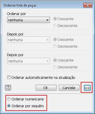 Use as novas opções das caixas de diálogo Ordenar lista de peças e Lista de materiais para controlar o comportamento de ordenação. Você pode especificar se deseja ordenar numericamente ou por um dígito à esquerda (sequência).