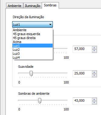 As configurações de sombra são gerenciadas individualmente em cada estilo de iluminação. Estas configurações estão localizadas na guia Sombras na interface do usuário do Editor de estilos. Uma nova opção, Ambiente, utiliza a imagem do ambiente para definir a direção da sombra.