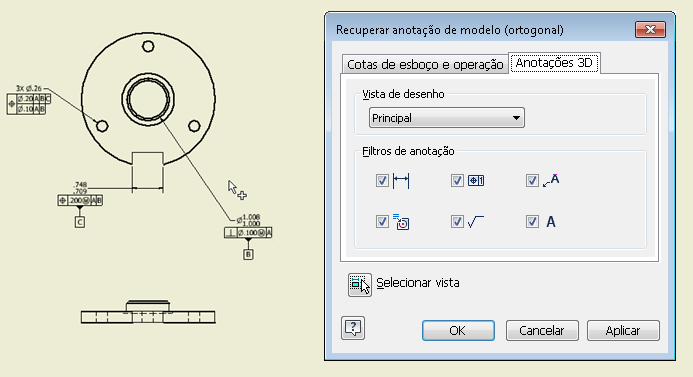 A nova guia Anotações 3D da caixa de diálogo Recuperar permite recuperar informações de MBD de uma peça e usá-las em um desenho. Use a Vista de projeto e as opções de filtro para visualizar as informações desejadas.
