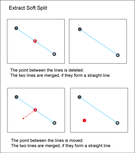 Case 1—Merges lines when the point between them is deleted. In the following case: They share the same attribute. The geometries are such that the two lines could be the result of a soft split.