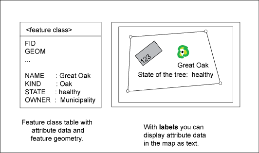 Data Model: Relations between feature table and label feature class. The attribute itself (name of the tree = Great Oak) is saved with the feature. To display this value as text in graphics, generate labels.