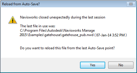 - Inicie o Autodesk Navisworks. Você será automaticamente instruído a recarregar o último arquivo em que estava trabalhando.