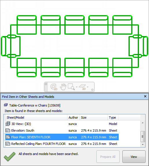 na janela Find Item in Other Sheets and Models, clique no botão Prepare All. Uma vez que todos os modelos/folhas tiverem sido preparados, você verá uma lista de todos os modelos/folhas que contêm o objeto.