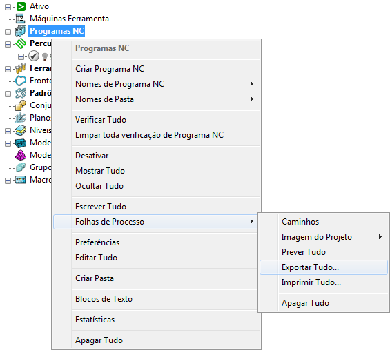 1. No menu de contexto Programas NC, selecione Folhas de Processo > Exportar Tudo.