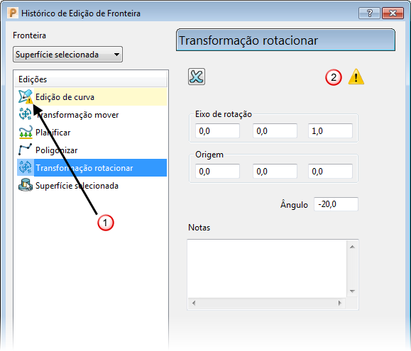 — Quando esse ícone é exibido, o histórico da fronteira contém uma ou mais edições em que um segmento de curva ou ponto foi selecionado. Caso a lista Edições contenha uma ou mais dessas edições seletivas, clicar em Calcular somente recalcula a fronteira até a primeira edição que exigia uma seleção, e apaga todas as edições subsequentes.