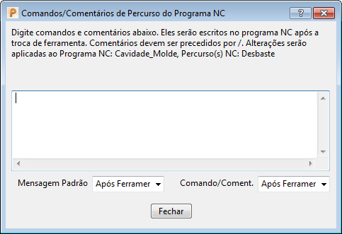 Comando/Coment. — Define onde os comandos/comentários que você adicionou acima terão saída gerada. Existem duas opções: antes de uma troca de ferramenta; depois de uma troca de ferramenta. Caso você insira um comando aqui, precisa ter certeza de que o arquivo de opção esteja configurado para esperar o comando.