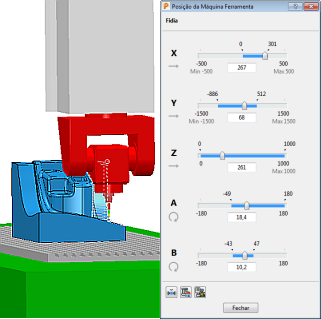 O diálogo exibe a posição de cada eixo da máquina ferramenta. Exibir o diálogo é útil pois permite visualizar o movimento dos eixos e, em particular, se um eixo é movido além do seu limite.