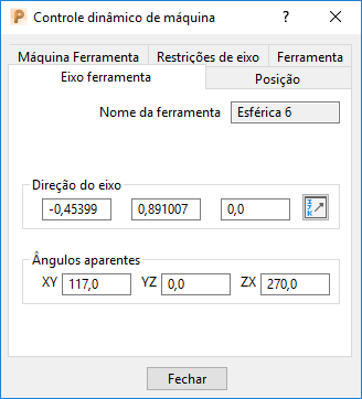 A guia Eixo ferramenta no diálogo Controle dinâmico de máquina exibe a direção do eixo ferramenta como vetores e ângulos aparentes. Os valores são atualizados automaticamente quando você utiliza alças de manipulação para ajustar o eixo ferramenta.