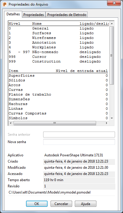 A guia Detalhes da caixa de diálogo Propriedades do Arquivo contém informações sobre níveis e objetos do modelo atual.
