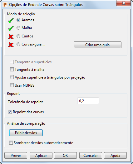 Para especificar opções de criação avançadas ao criar uma superfície usando a opção Rede sobre triângulos, clique em Avançado em Criador de Superfície para exibir a caixa de diálogo Opções de Rede de Curvas sobre Triângulos: