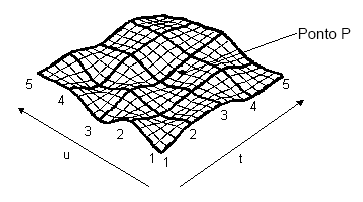 Os valores de t e u definem um ponto único, p, na superfície. Assim, o ponto p pode ser definido por coordenadas no espaço absoluto 3D (x, y, z) ou por coordenadas no espaço paramétrico 2D (t e u). Na figura abaixo, as coordenadas no espaço paramétrico 2D de p são (3,5 e 2,75).