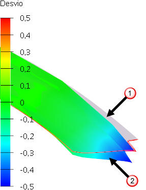 - Morph afastando da nuvem/malha — Selecione essa opção para aplicar um morph inverso, e mover o geometria CAD na direção oposta dos dados de medição. Isso permite compensar distorções no processo de manufatura, como retorno elástico.
