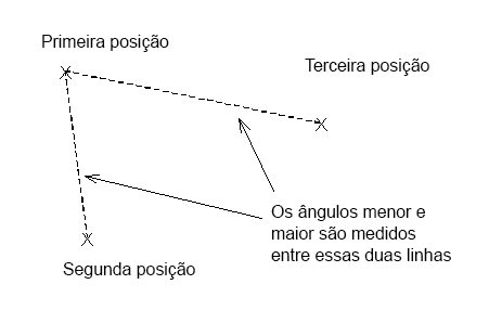 Especifique três posições para definir duas linhas, como mostrado abaixo. Os ângulos menor e maior são medidos entre essas duas linhas: