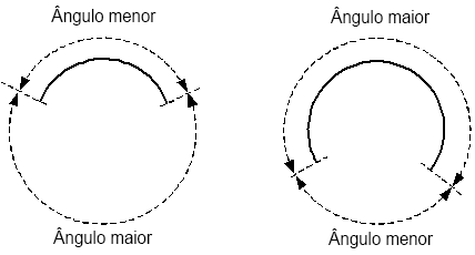 Os ângulos maior e menor são os segmentos do setor do arco e do setor ausente do arco, como mostrado abaixo: