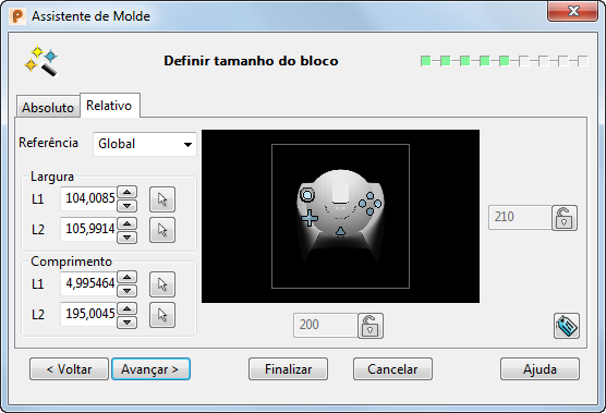 Um bloco é criado automaticamente em torno do objeto selecionado, a menos que você tenha acessado o Assistente de Molde com um bloco já definido. Para especificar o tamanho do bloco, você pode utilizar valores absolutos ou relativos. O assistente mostra uma imagem da peça sombreada e do bloco em modelo de arames. Você também pode rotacionar, aproximar, afastar e arrastar essa imagem utilizando o mouse.