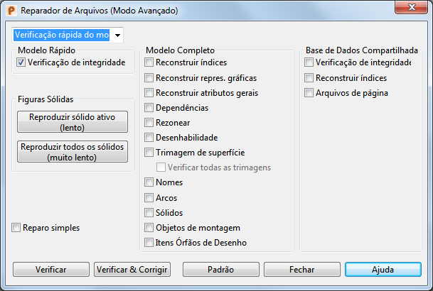 Aviso: Corrigir um modelo pode causar danos consideráveis. Crie sempre uma cópia de backup de um modelo antes de clicar no botão Verificar e Corrigir. Todos os erros encontrados pelo Reparador de Arquivos são potencialmente graves e podem fazer com que o programa trave ou funcione mal (talvez causando mais erros). Sempre remova os erros com Verificar e Corrigir antes de continuar. NÃO continue trabalhando com um modelo ou base de dados corrompidos.