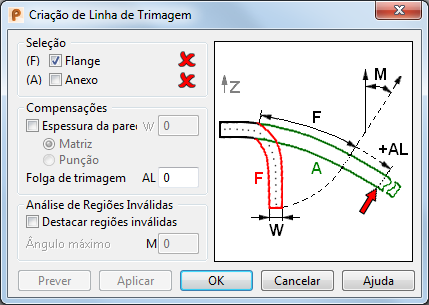- Espessura da parede — Especifica a espessura da flange. Selecione essa opção para usar a espessura (W) ao calcular a linha de trimagem.