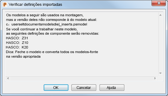 Quando você abre um modelo que contém definições de componente, e o modelo fonte foi criado de uma versão do PowerShape com um número de versão do modelo diferente do programa atual, a caixa de diálogo Verificar Definições Importadas é exibida. Ele lista: