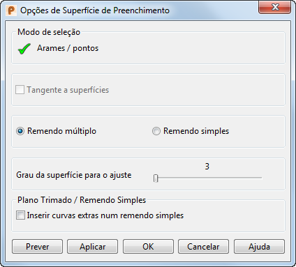 Para especificar as opções de criação avançada ao criar uma superfície utilizando a opção Preenchimento, clique em Avançado no diálogo Criador de Superfície para exibir o diálogo Opções de Superfície de Preenchimento.