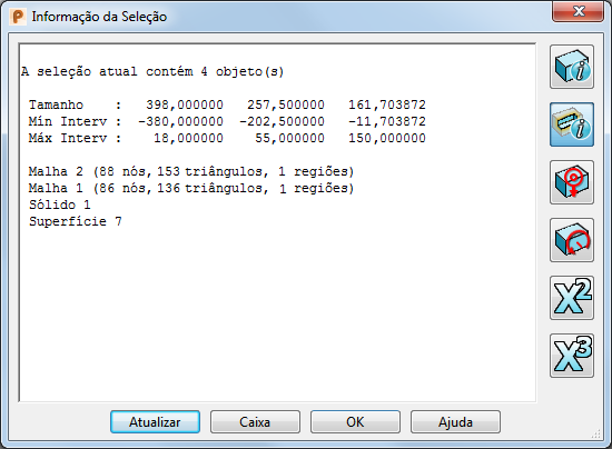 Utilize a guia Início > painel Seleção > Informação para exibir informações sobre os objetos selecionados no diálogo Informação da Seleção: