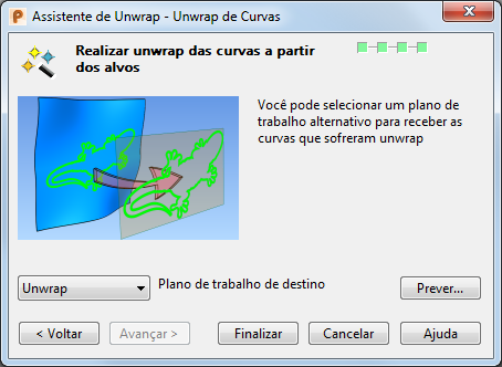 - Prever — Aplica unwrap e posiciona as curvas no plano de trabalho selecionado. Isso permite que as curvas que sofreram unwrap sejam modificadas e sofram wrap de volta para o objeto alvo utilizando o Assistente de Rewrap.
