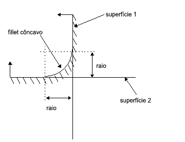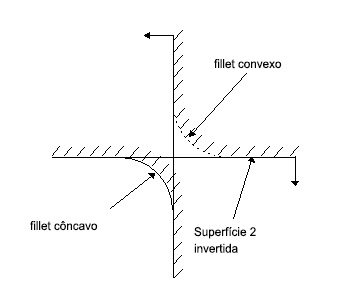 O exemplo abaixo mostra uma solução de fillet entre duas superfícies utilizando a opção Côncavo. As setas apontando para fora da superfície indicam as normais.