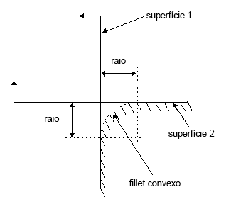 O exemplo abaixo mostra uma solução de fillet entre duas superfícies utilizando a opção Convexo. As setas apontando para fora da superfície indicam as normais.