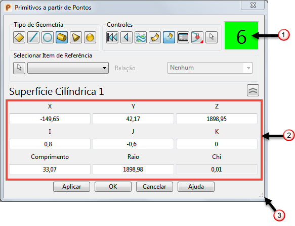 — Clique nesse botão para exibir o diálogo para edição do primitivo apropriado. Por exemplo, para uma superfície cilíndrica, o diálogo Cilindro é exibido.