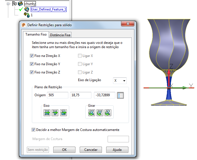 - Utilizando o diálogo Definir Restrições para figura, adicione uma restrição de Tamanho Fixo na figura definida pelo usuário nas direções X, Y e Z, movendo a coordenada Z da origem do Plano de Restrição para -33.72899.