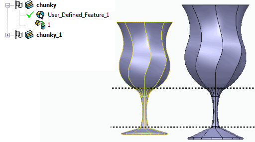 O exemplo a seguir mostra como escalar o corpo de uma taça de vinho, mantendo a haste da taça com o mesmo comprimento.