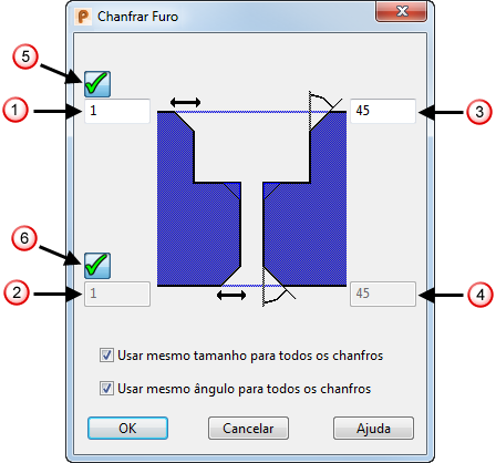 Usar mesmo tamanho para todos os chanfros — Selecione essa opção para especificar que todos os chanfros que são adicionados ao furo são do mesmo tamanho. Desmarque essa opção para definir diferentes tamanhos de chanfro para a base do furo e furo passante, inserindo valores diferentes em